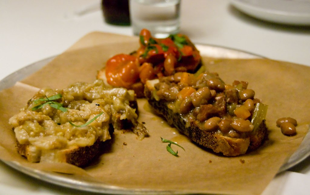 Am inceput cu un trio de paine prajita cu salata de vinete (care surprinzator avea ghimbir proaspat, o combinatie care mie mi-a placut foarte mult), fasole
